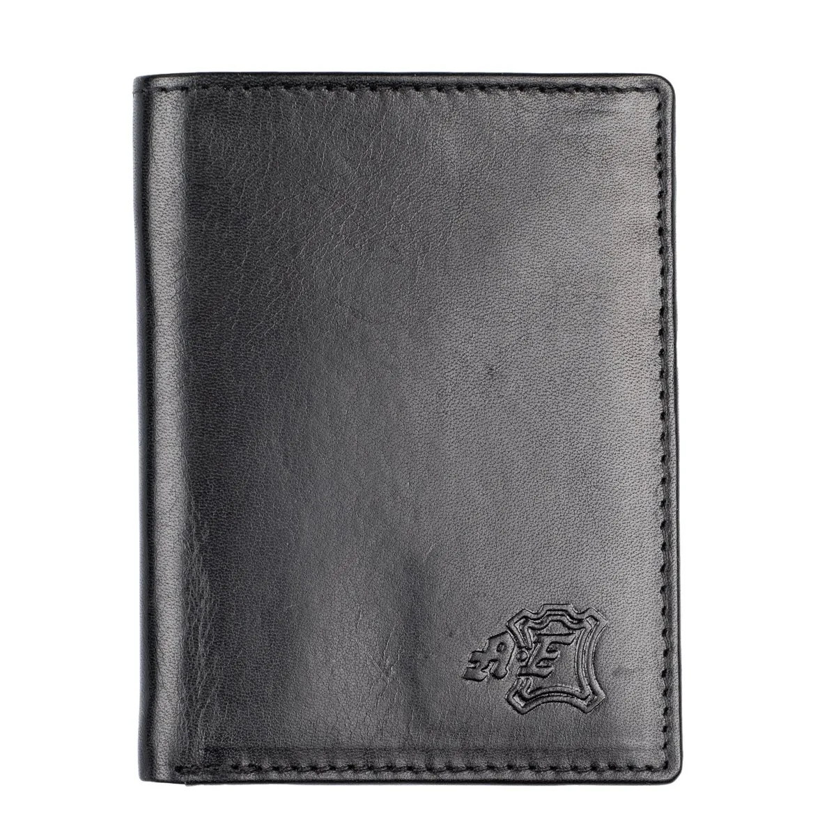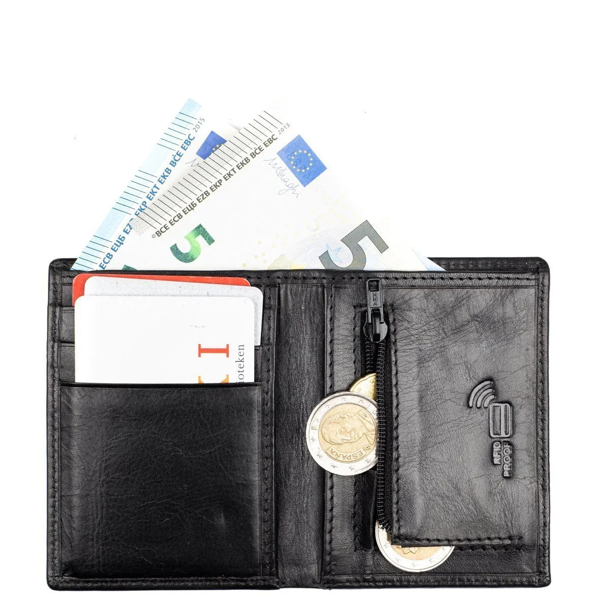 Tyylikäs pieni nahkainen RFID-suojattu korttilompakko. Kolme korttipaikkaa, pari muuta väliä, taustalla seteliväli ja kolikoille pieni vetoketjutasku. Takapuolella ikkunallinen korttitasku.