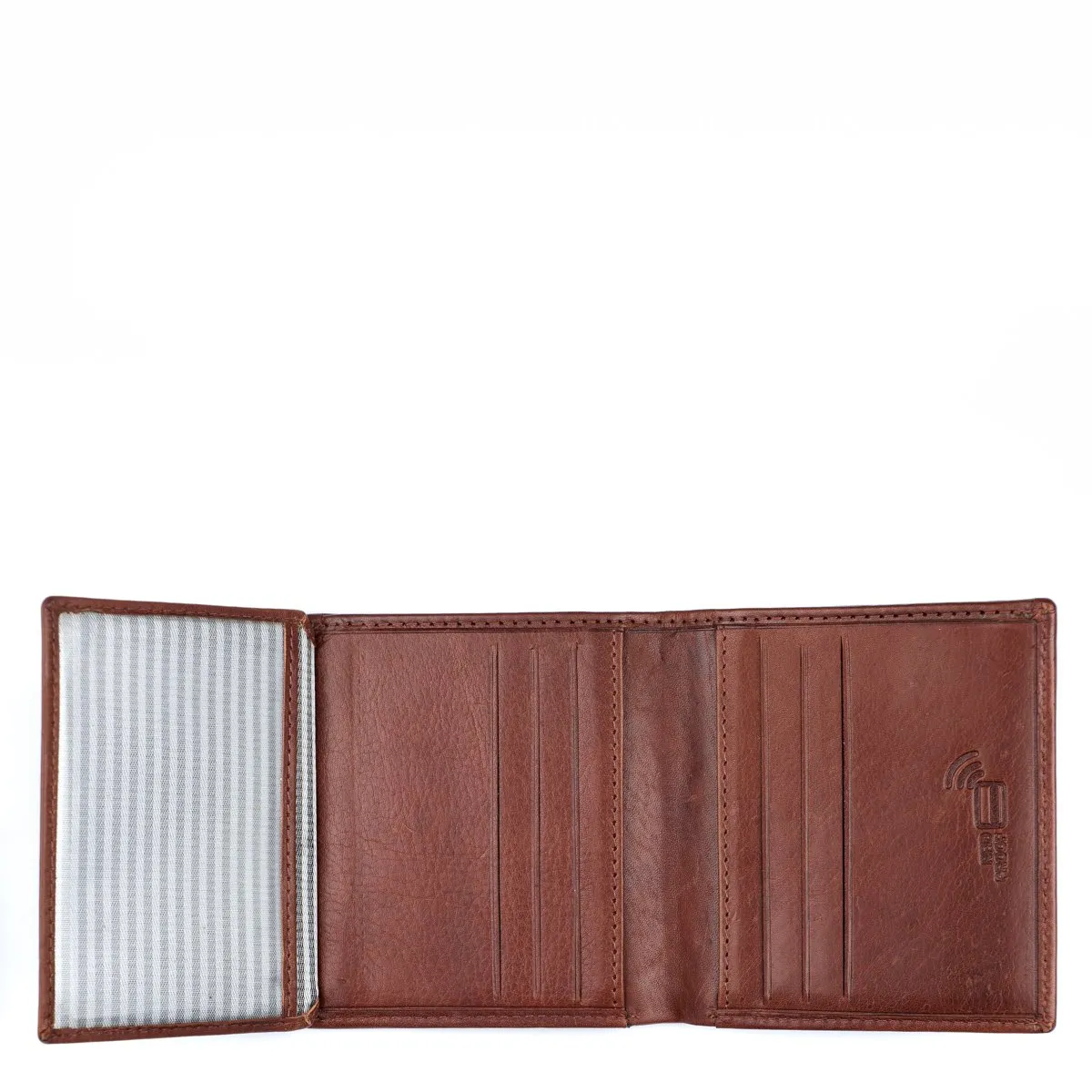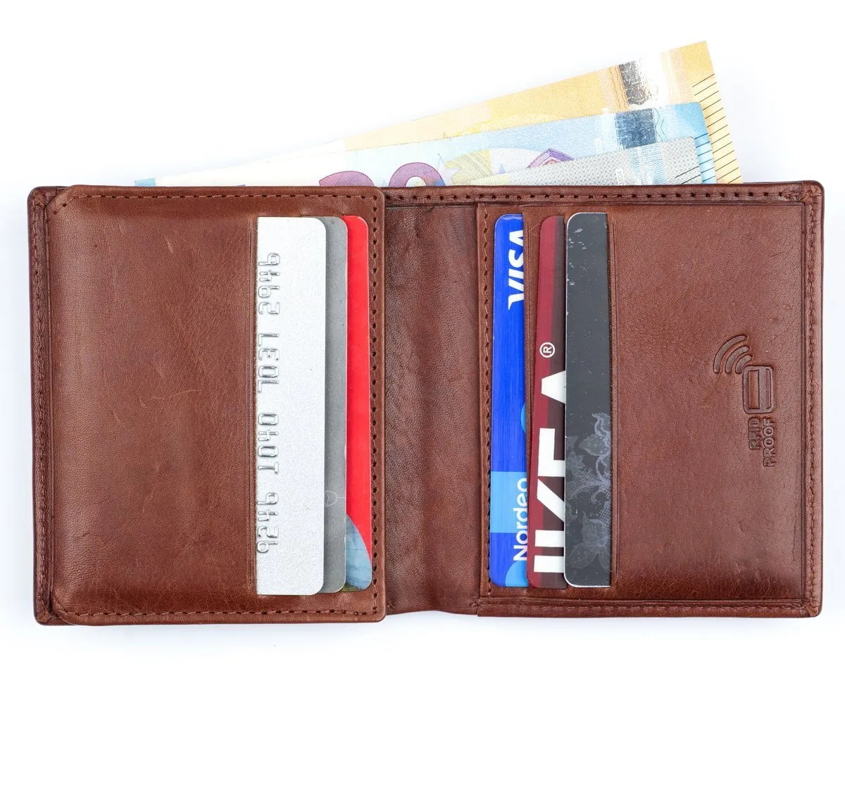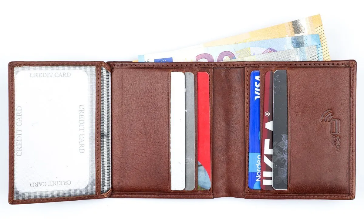 Tyylikäs nahkainen RFID-suojattu* korttilompakko. Tässä hyvin taskuun mahtuvassa lompakossa on kymmenen korttipaikkaa, joista yksi on ikkunallinen. Taustalla seteliväli. Tässä mallissa ei ole kolikkotaskua *RFID-suojaus estää lähimaksukorttien etäluvun.