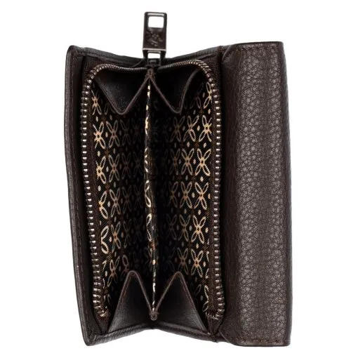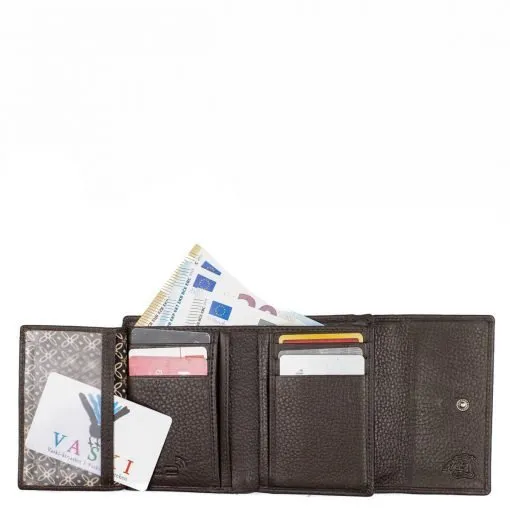 Näppärä nahkalompakko RFID-suojauksella. Läpässä sulkemista helpottava tuplaneppari. Yhdeksän tavallista korttipaikkaa, yksi ikkunallinen korttipaikka sekä useita muita välejä. Taustalla kaksiosainen seteliväli ja takapuolella kaksiosainen vetoketjullinen kolikkotasku.