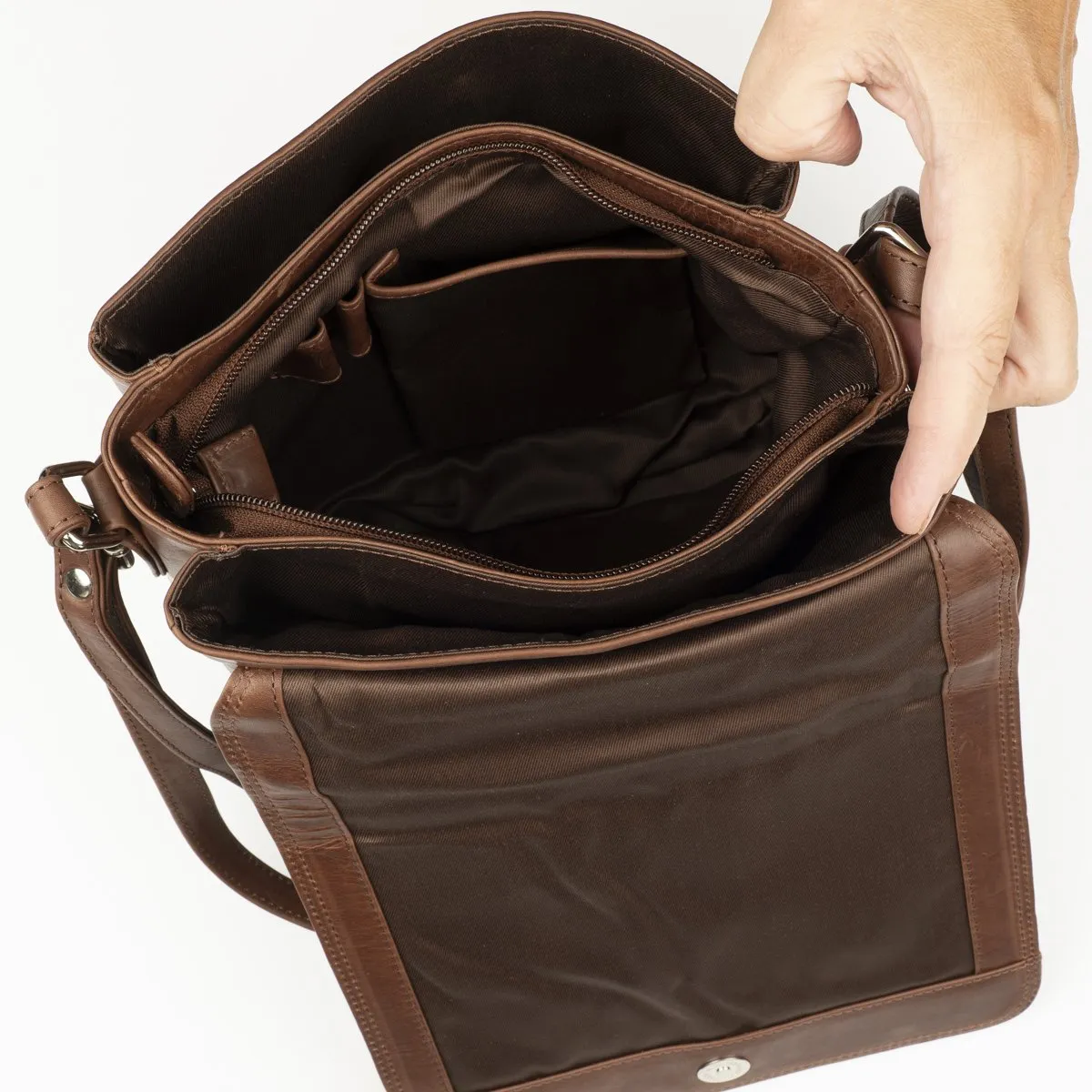 A. Erikssonin Eckerö-malliston tyylikäs nahkainen Emma-olkalaukku useilla taskuilla. Magneettikiinnitteisen läpän alla on kolme lokeroa joista keskimmäinen on vetoketjulla suljettava ja siinä on puhelintasku, pari kynäpaikkaa ja vetoketjullinen tasku. Lisäksi laukun takapuolella vielä vetoketjullinen tasku. Portaattomasti säädettävä olkahihna 70 – 140 cm. Mitat 22 x 21 x 7 cm, paino 460 g.