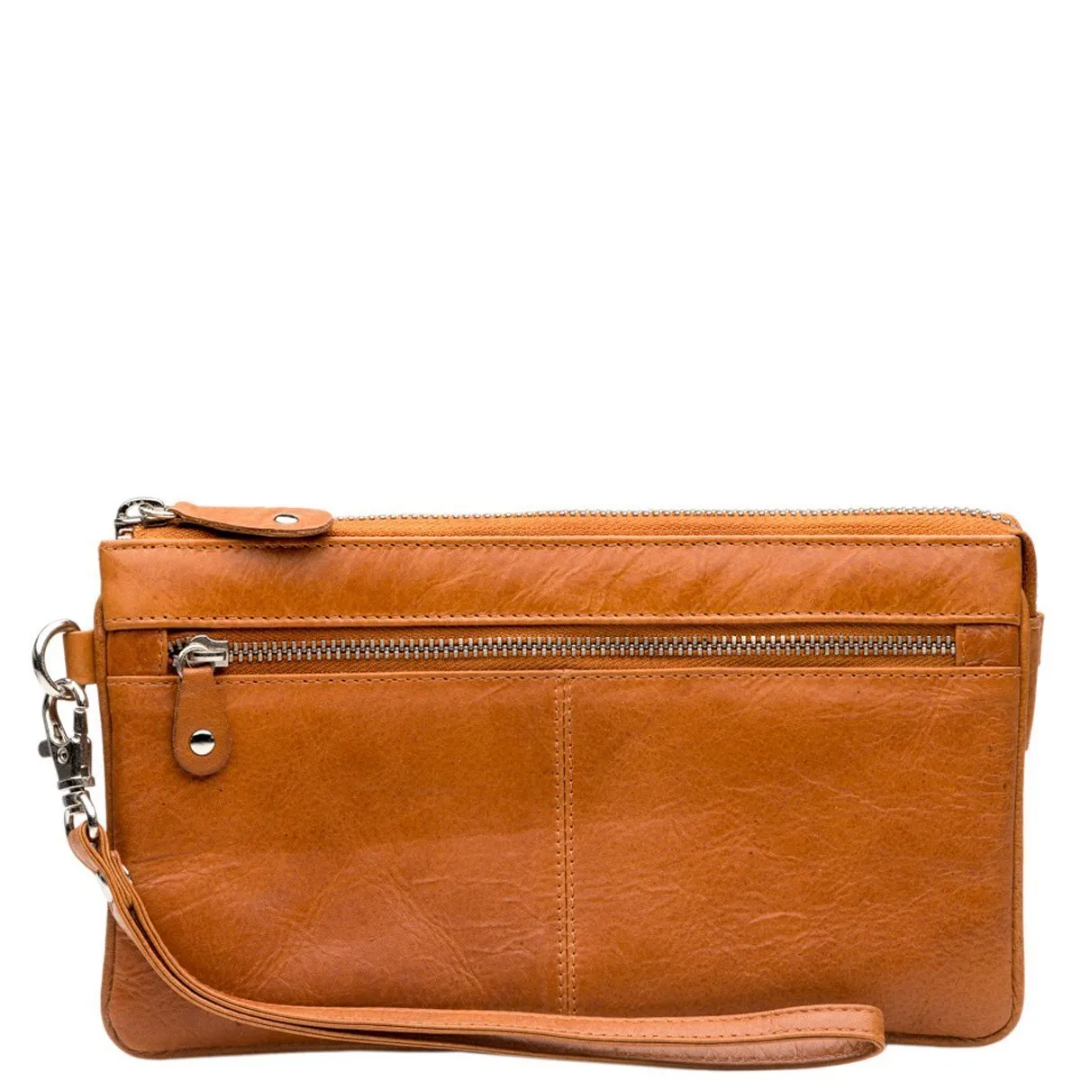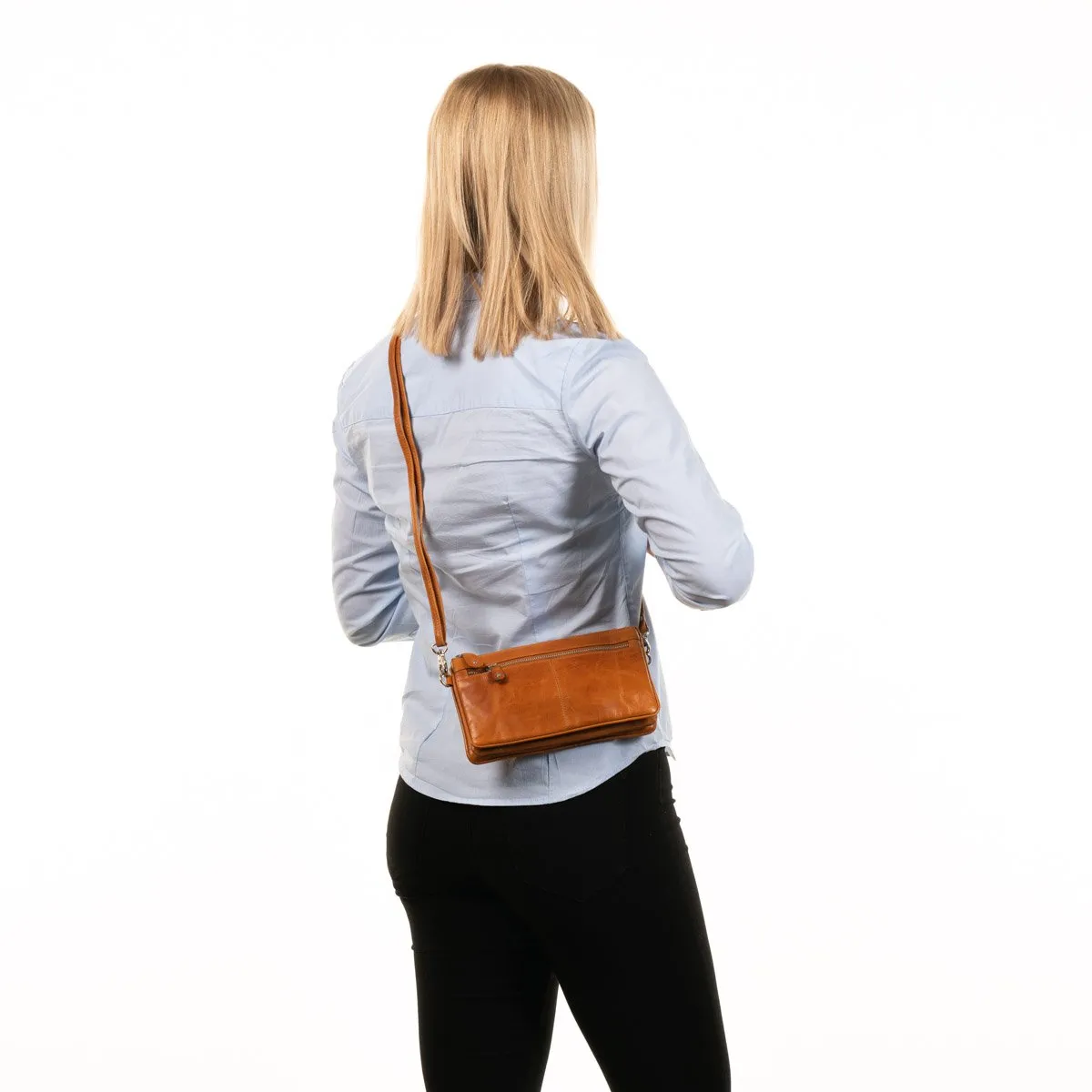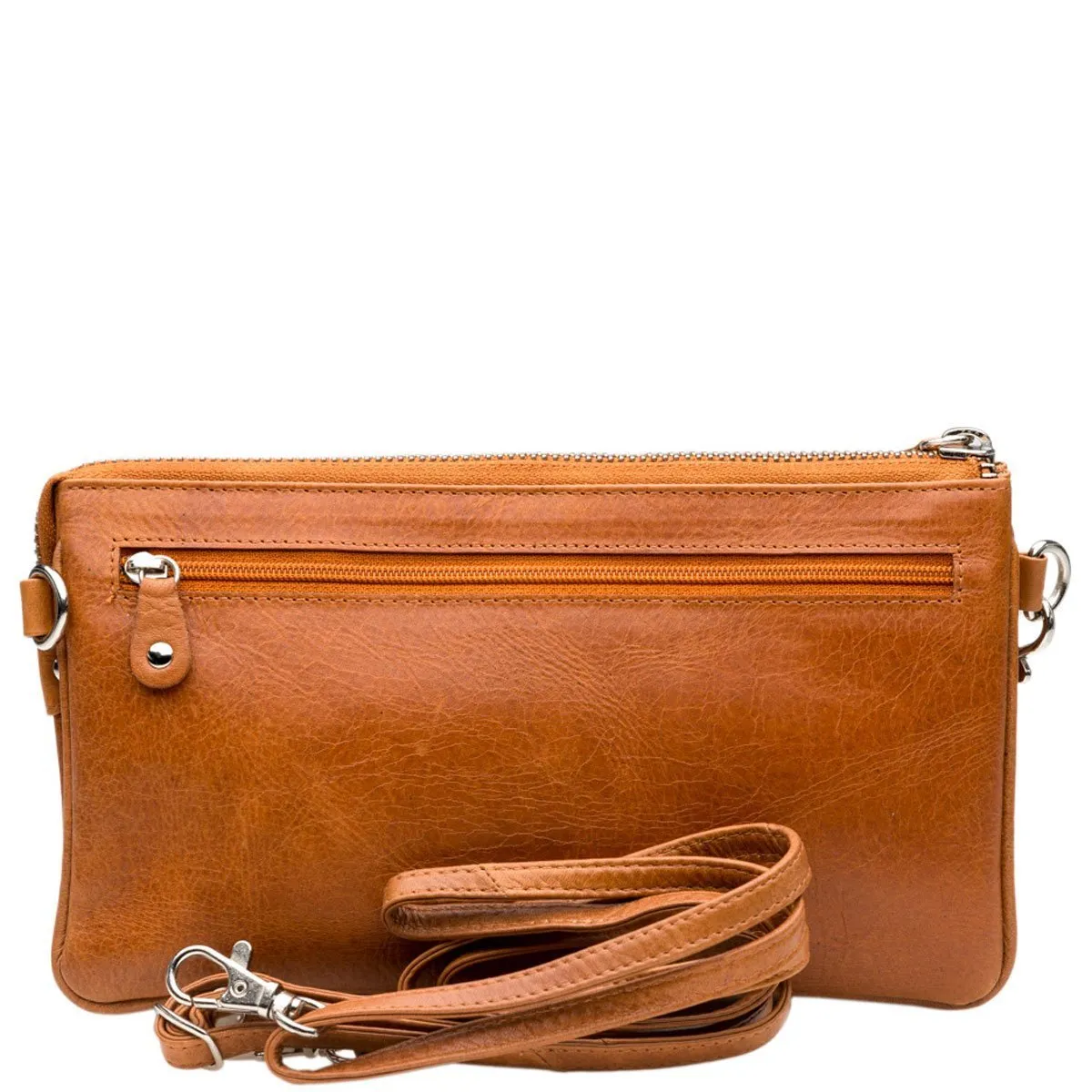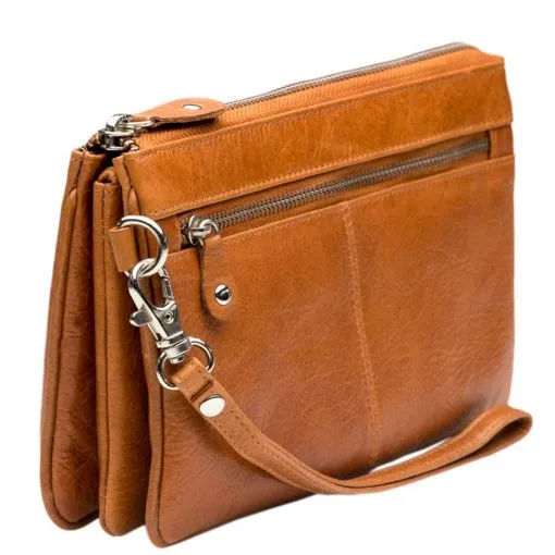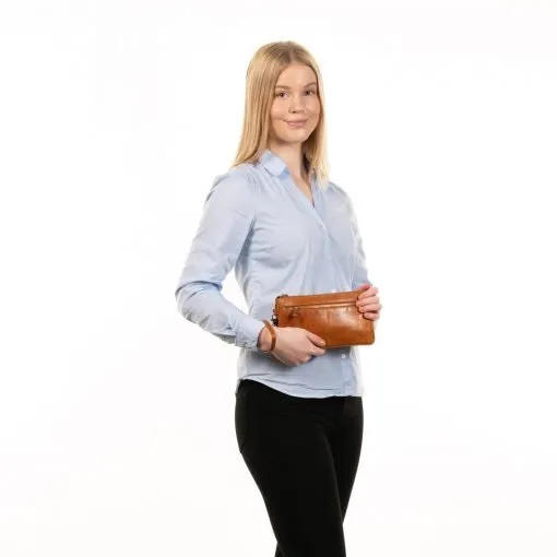 Tyylikäs nahkainen pikkulaukku rannelenkillä sekä pitkällä sirolla olkahihnalla. Vetoketjulliset taskut etu- ja takapuolilla. Vetoketjullisessa päätaskussa useita lokeroita joihin pikkutavarat saa loistavasti järjestykseen, lisäksi korttipaikat ja kaksi vetoketjutaskua.