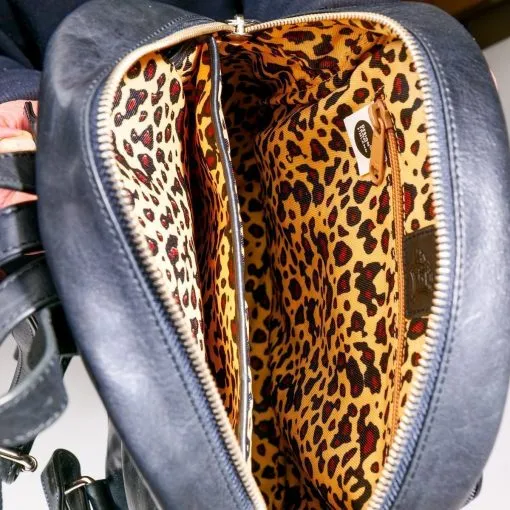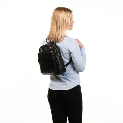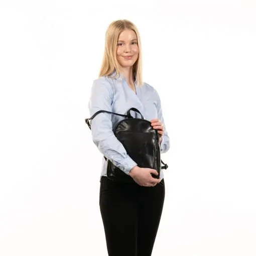 Klassinen nahkareppu vetoketjullisella etutaskulla. Repun päätasku suljetaan vetoketjulla ja sisällä on pehmustettu lokero tabletille. Takana ja sisällä vetoketjulliset pikkutaskut. Etutaskun sisällä on kännykkätasku. Olkainten pituus on säädettävissä.