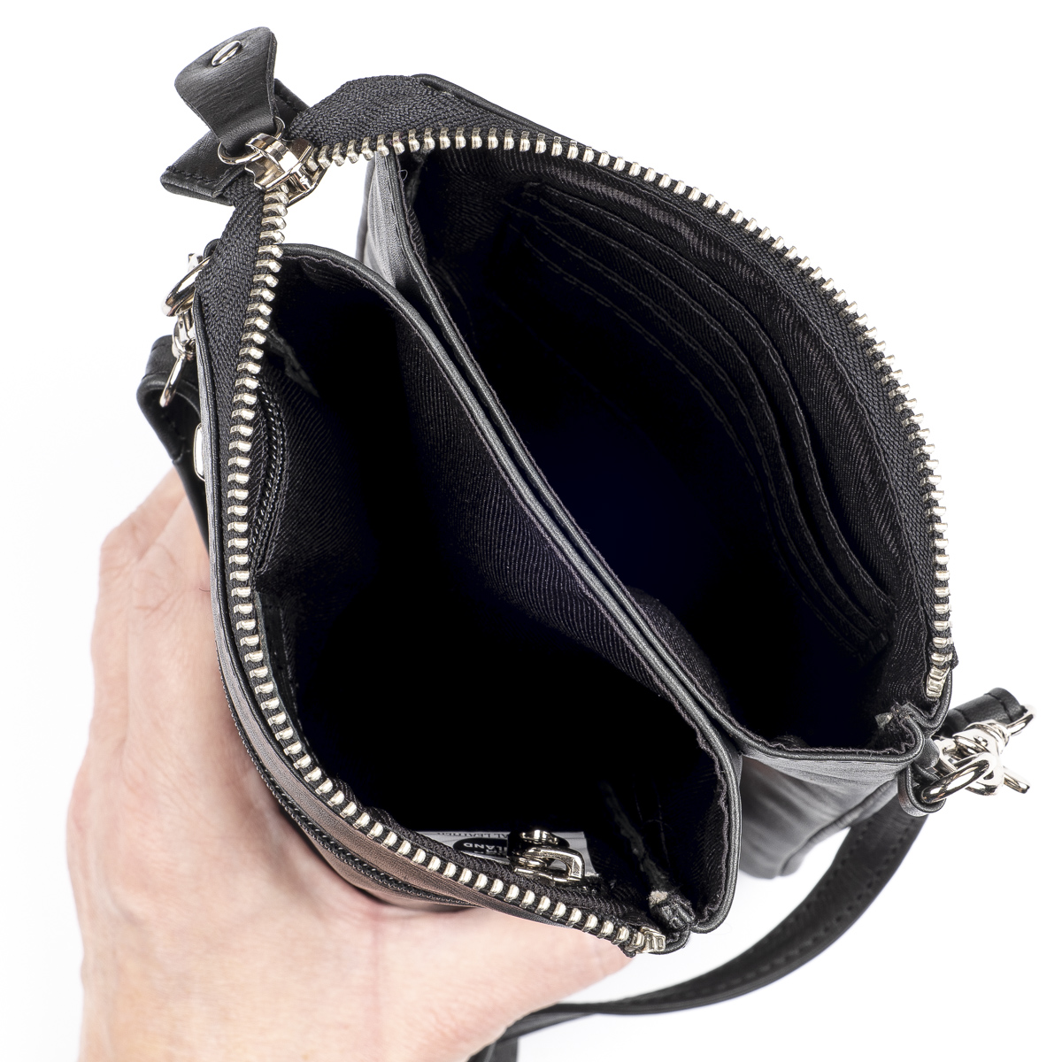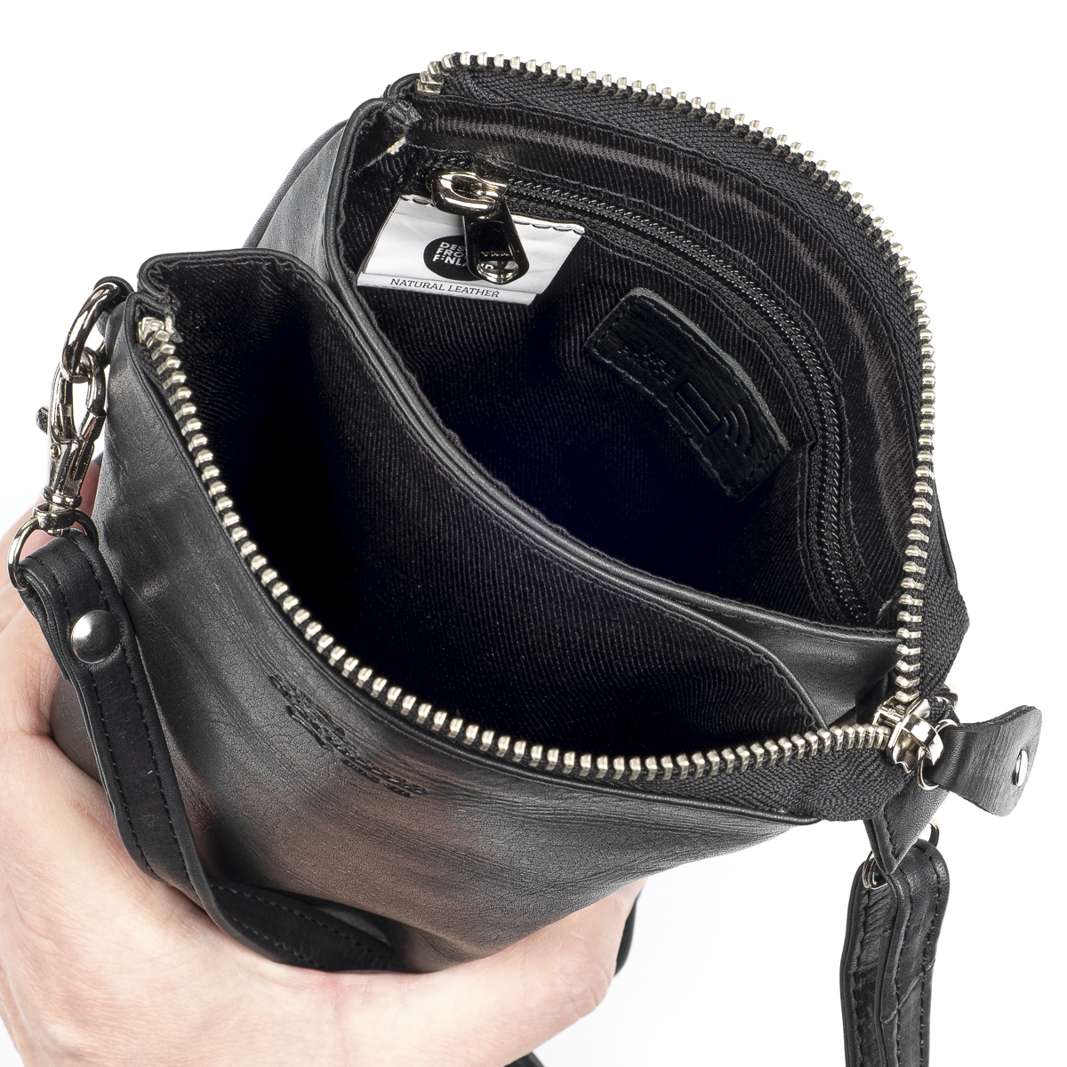 Vetoketjulla suljettavan päätaskun sisällä on kaksi tilavaa lokeroa. Toisessa on käytännöllinen vetoketjutasku, toisessa neljä korttipaikkaa. Lokeroiden väliin jää lisäksi kapea lisätasku, joka sopii esimerkiksi kuiteille tai muille pienille tärkeille tavaroille. Laukku on RFID-suojattu, mikä estää lähimaksukorttien ja muiden sirullisten korttien luvattoman etäluvun.