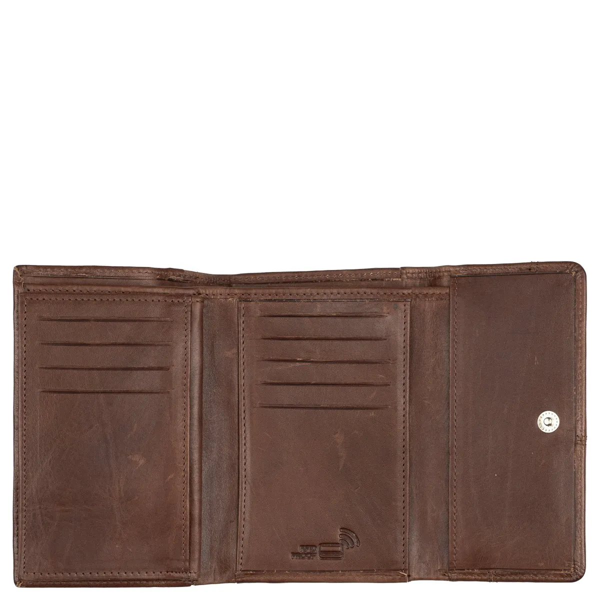 Monipuolinen nahkalompakko koristetikkauksella. Neppariläpän takana 14 korttipaikkaa, iso ikkunallinen korttipaikka esimerkiksi ajokortille sekä useita muita välejä. Taustalla tilava seteliväli. Lompakon takapuolella on vetoketjullinen kaksiosainen kolikkotasku.