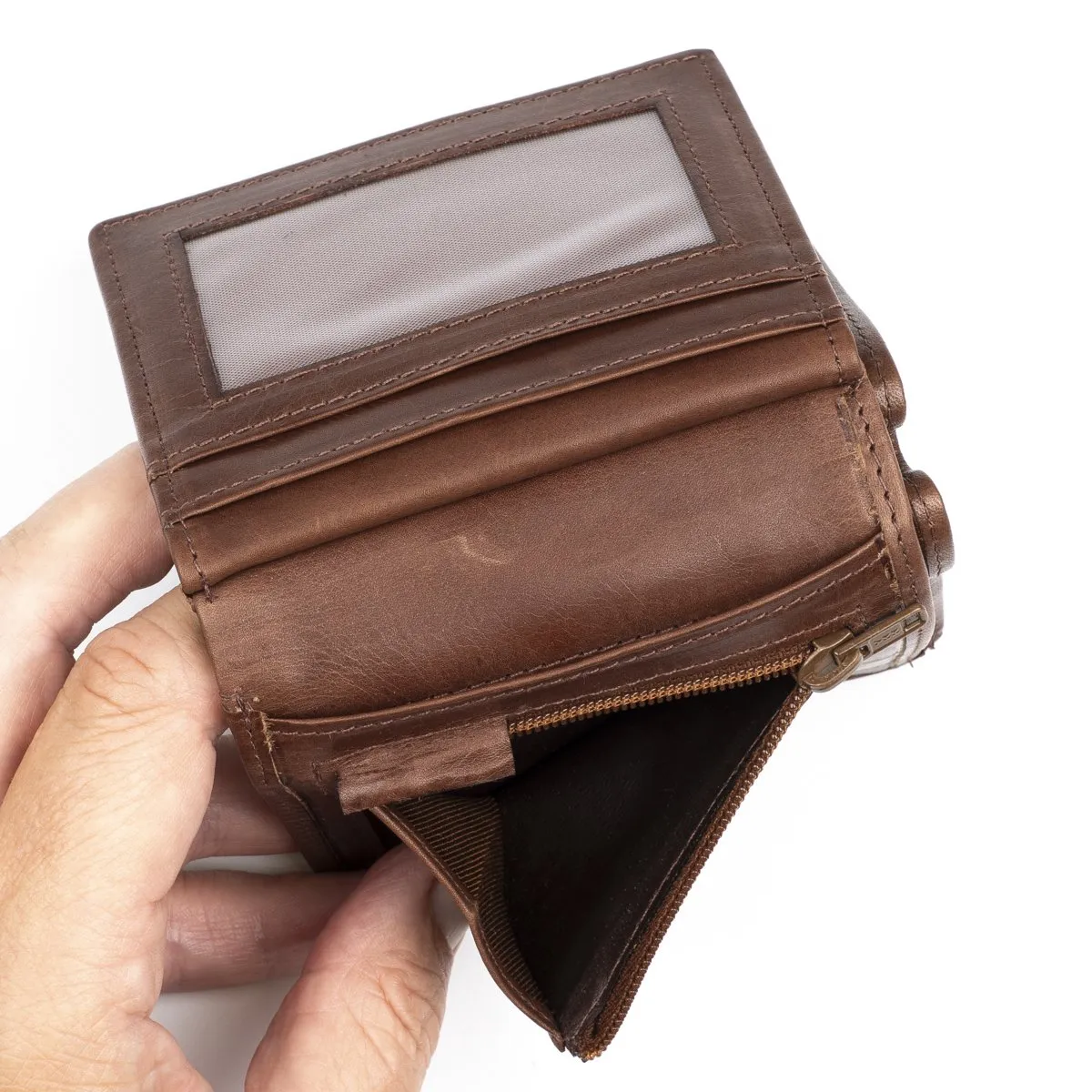Näppärä pieni nahkalompakko kymmenellä korttipaikalla sekä vetoketjullisella kolikkotaskulla. Yksi korttipaikoista on ikkunallinen. Lompakon taustalla on kaksiosainen seteliväli. Lompakossa on RFID-suojaus, joka estää sirullisen etäluettavien korttien etäluvun.