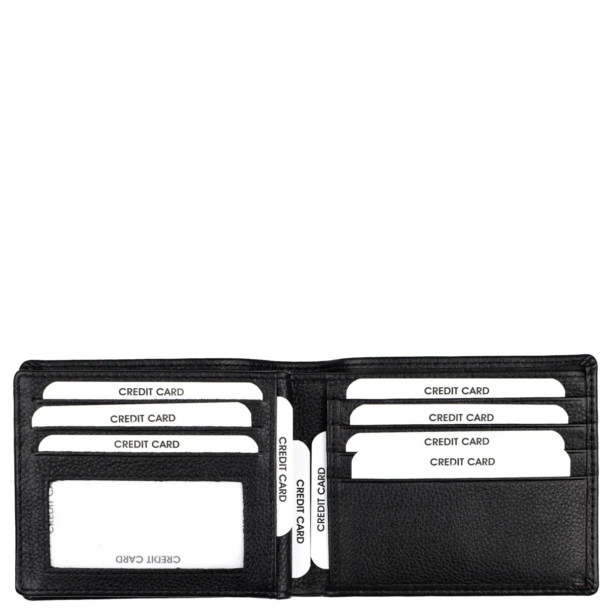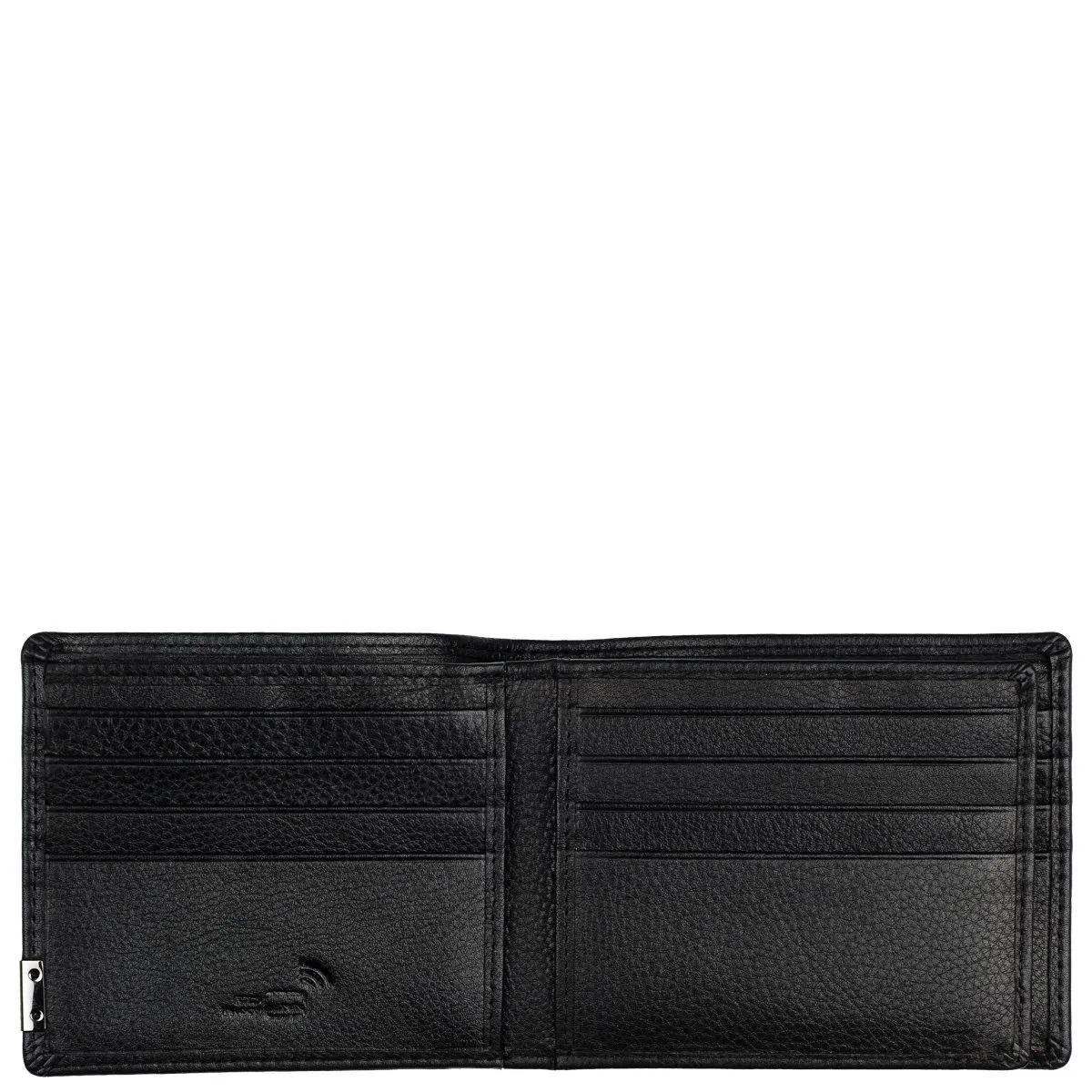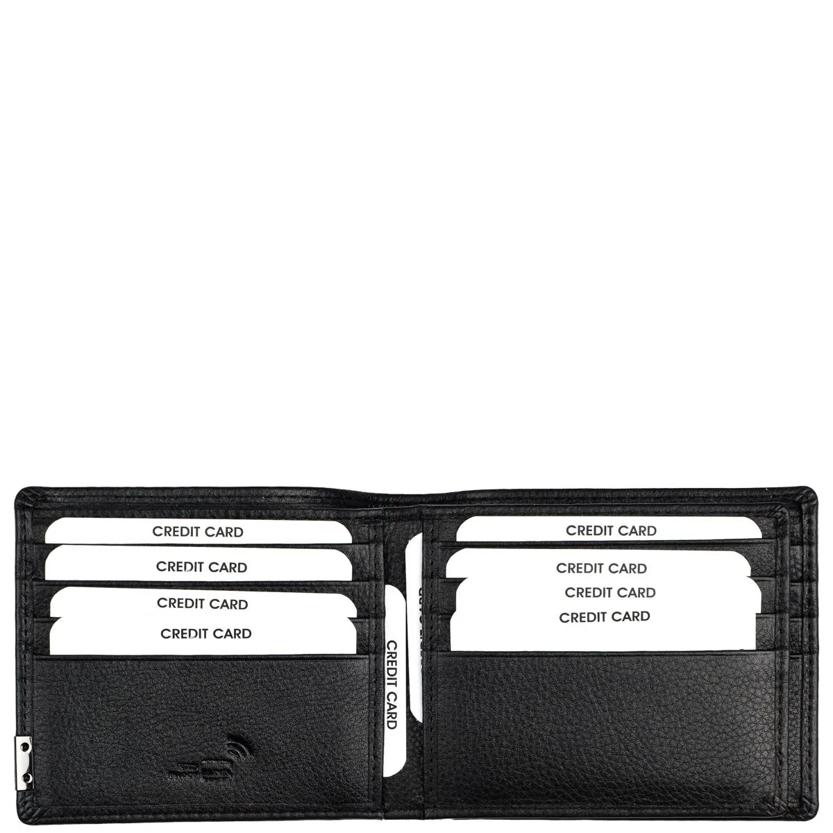 Vaakamallinen RFID-suojattu lompakko pehmeää nahkaa. 11 korttipaikkaa joista yksi ikkunallinen. Taustalla kaksiosainen seteliväli ja kolikoille vetoketjullinen tasku. Mitat 11 x 9 cm.