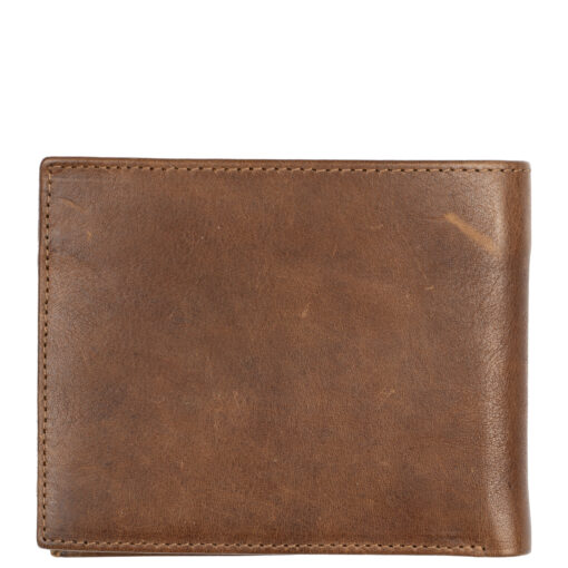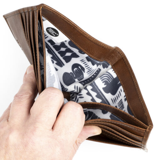 Klassinen nahkalompakko maksukorttien luvattoman etäluvun estävällä RFID-suojauksella. Kahdeksan korttipaikkaa, kaksi muuta taskua ja taustalla leveä kaksiosainen seteliväli.