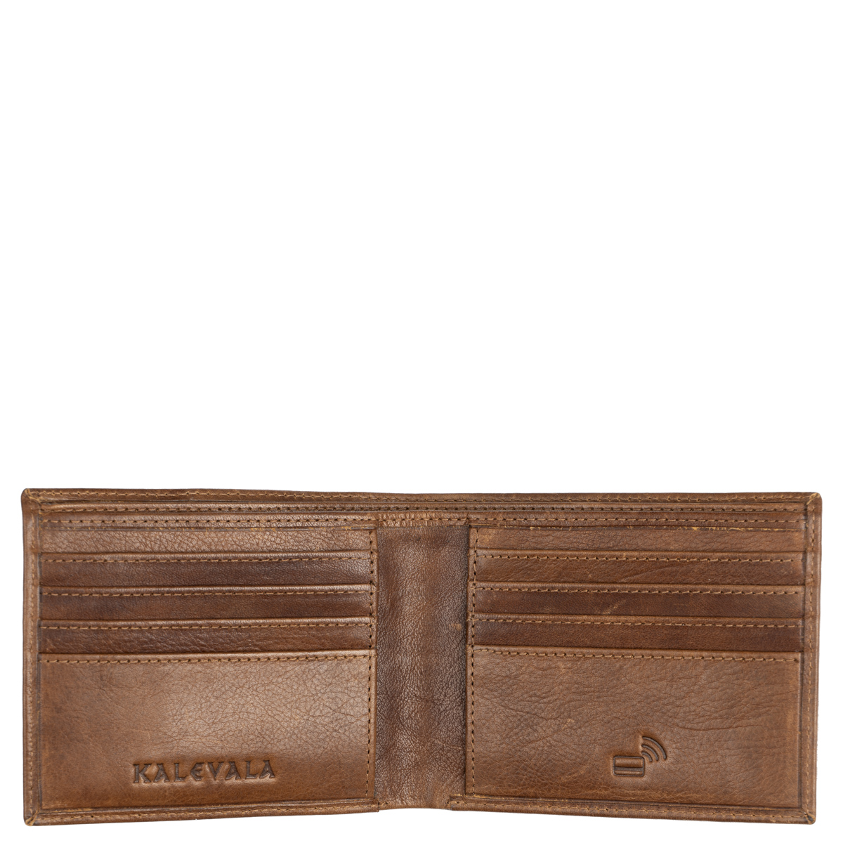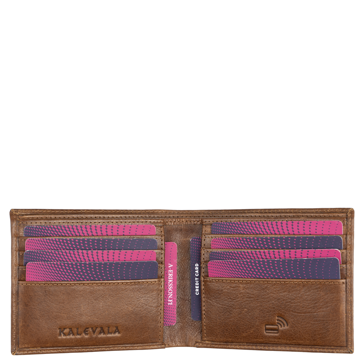 Lompakossa on kahdeksan korttipaikkaa, kaksi muuta monikäyttöistä taskua sekä taustalla leveä, kaksiosainen seteliväli. Kalervo on perinteinen mutta toimiva valinta, joka kestää aikaa ja käyttöä.
