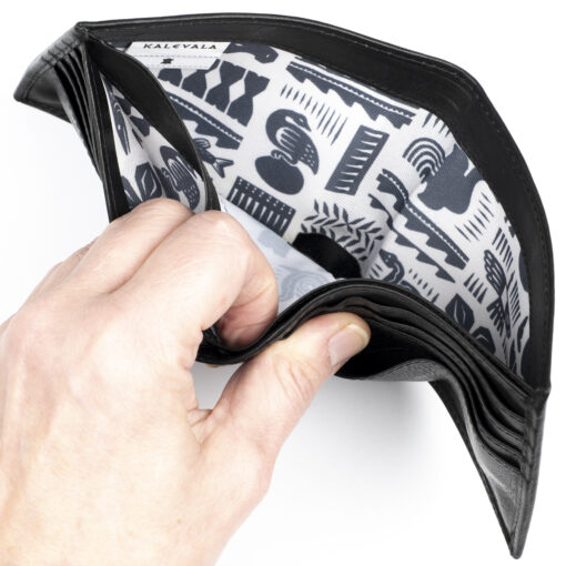 Kalevala: Kalervo on klassinen ja ajaton nahkalompakko, joka on suunniteltu selkeää järjestystä ja turvallisuutta arvostavalle käyttäjälle. RFID-suojaus estää maksukorttien luvattoman etäluvun ja tuo huolettomuutta arkeen.