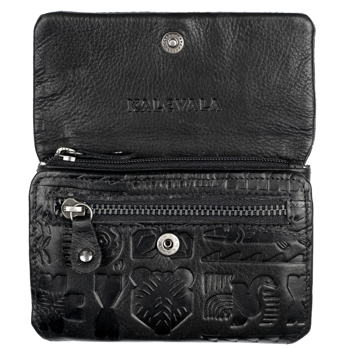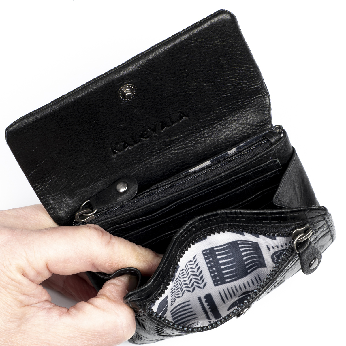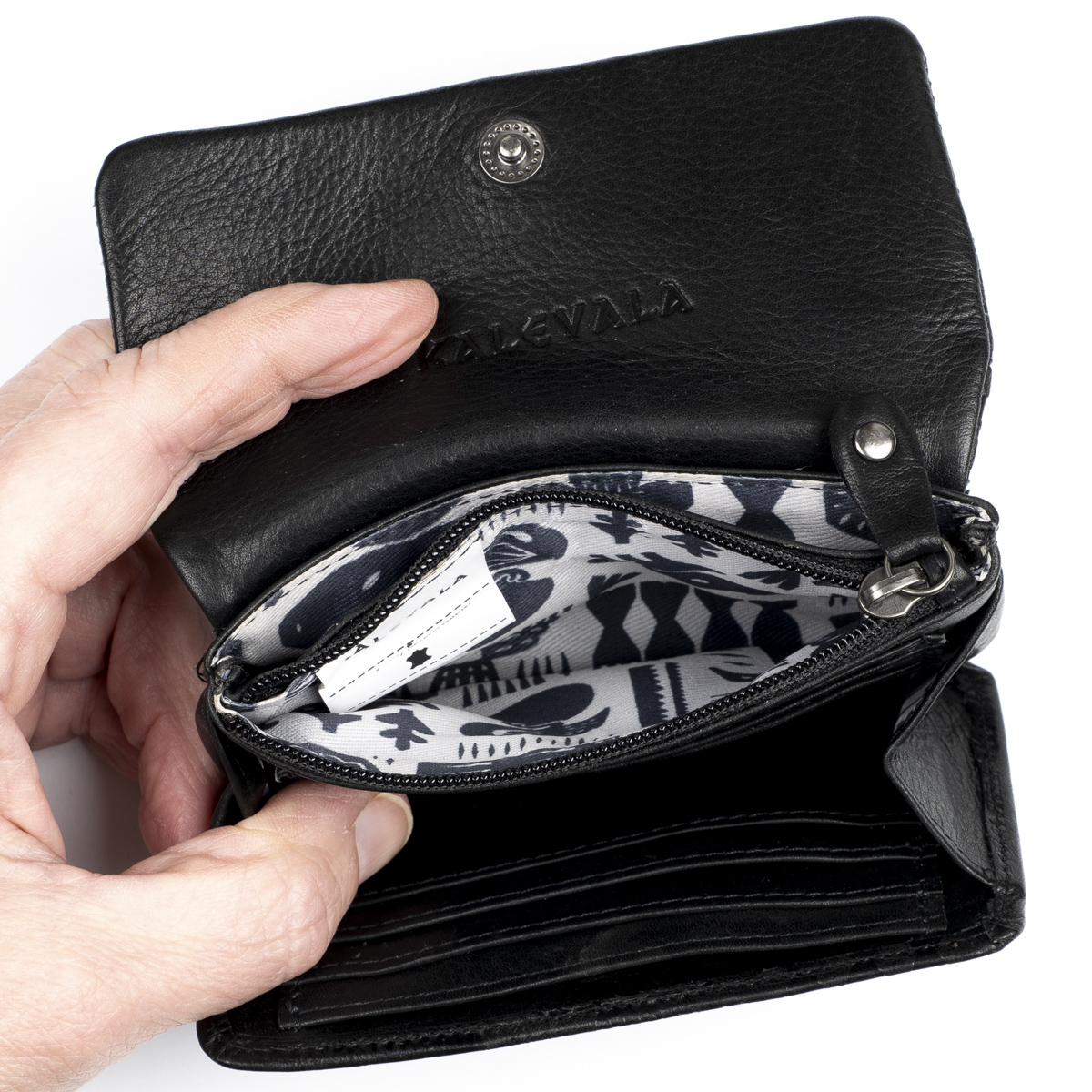 Monipuolinen nahkainen kukkaro kauniilla Kalevala-teemaisella painatuksella. Neppariläpän alla on vetoketjullinen tasku, jonka molemmin puolin välikkö esimerkiksi taitetuille seteleille/kuiteille. Kuusi korttipaikkaa ja vetoketjutaskut etu- ja takapuolella.