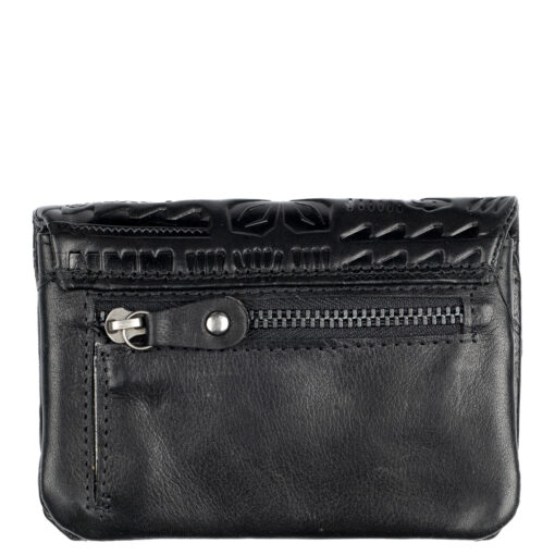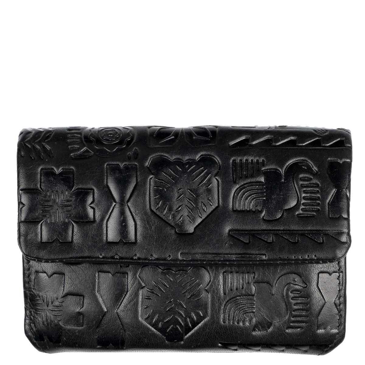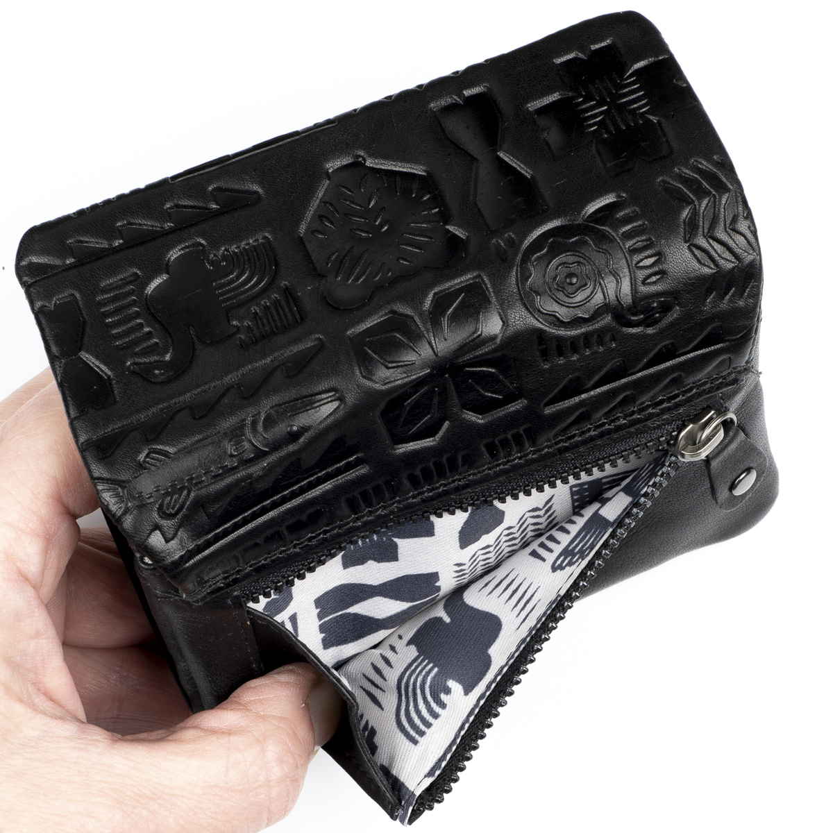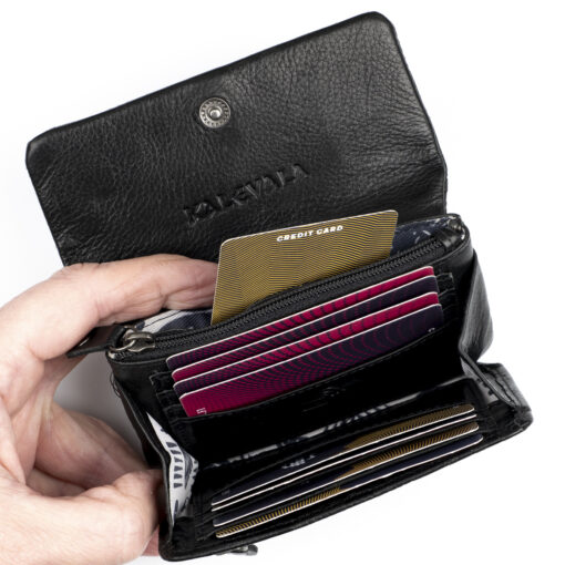 Monipuolinen nahkainen kukkaro kauniilla Kalevala-teemaisella painatuksella. Neppariläpän alla on vetoketjullinen tasku, jonka molemmin puolin välikkö esimerkiksi taitetuille seteleille/kuiteille. Kuusi korttipaikkaa ja vetoketjutaskut etu- ja takapuolella.