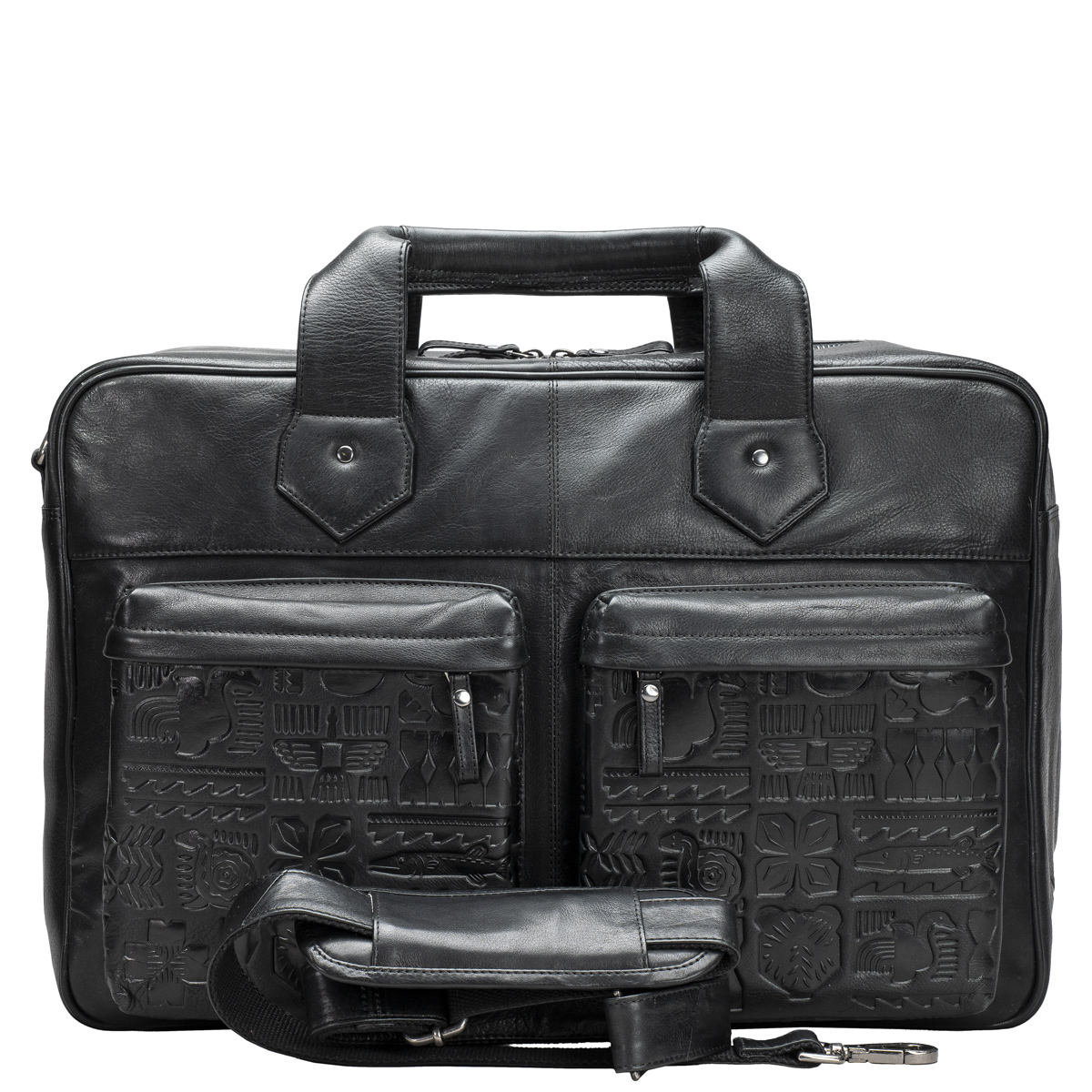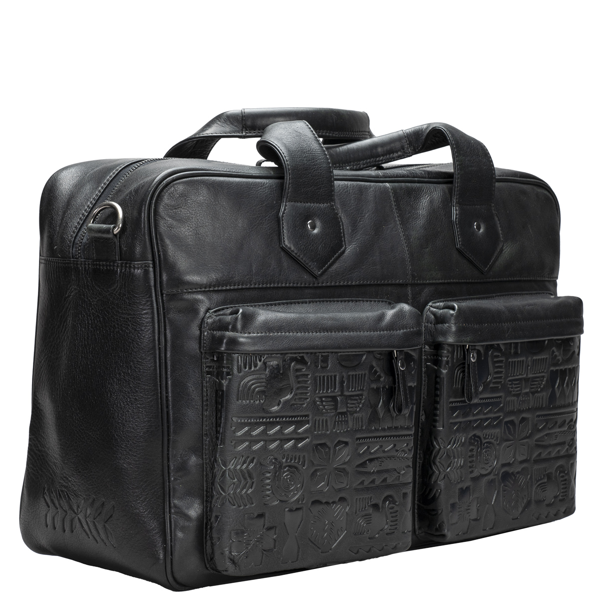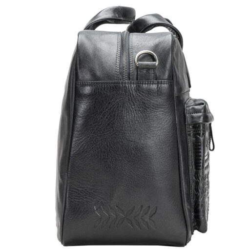 Tyylikäs matkakassi Kalevalasta inspiroituneilla yksityiskohdilla. Vetoketjulla avautuva tilava päätasku, jossa avoin tasku esimerkiksi puhelimelle sekä leveä vetoketjutasku. Etupuolella kaksi vetoketjullista taskua. Tukevat kantokahvat sekä irrotettava ja säädettävä pitkä olkahihna levikepehmikkeellä. Metallitassut laukun pohjassa suojaavat ja pitävät laukun ryhdikkäänä.