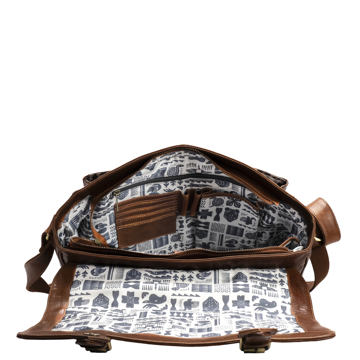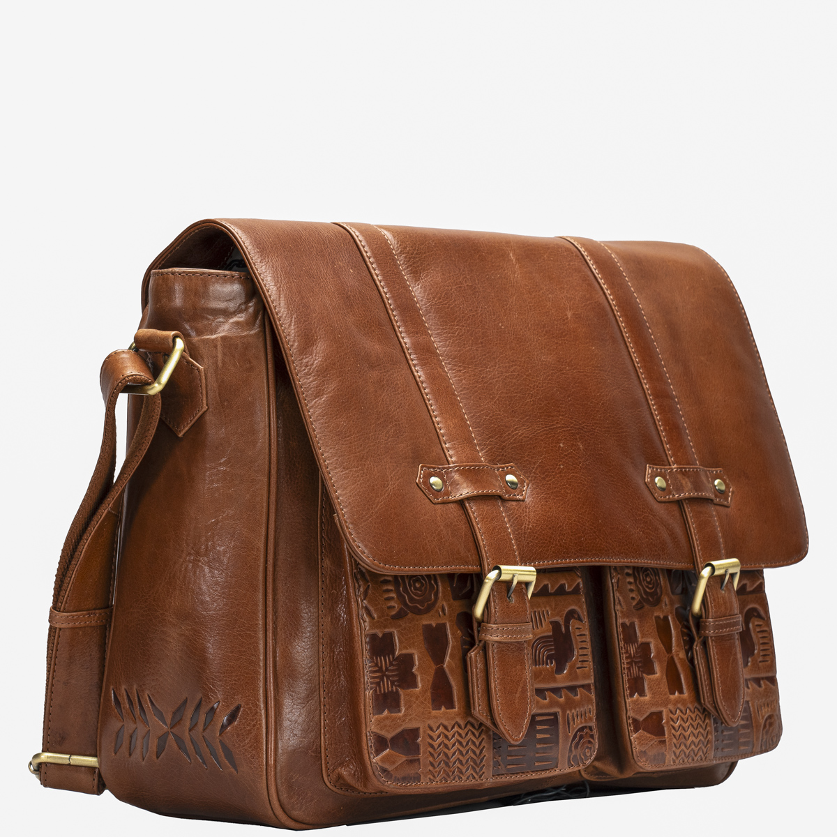 Kalevalasta inspiraatiota saanut nahkainen työlaukku pehmustetulla tietokonetaskulla. Kahdella magneetilla paikoillaan pysyvä läppä, jonka alla päätaskussa vetoketjusuljenta ja kaksi avointa etutaskua. Sisällä tarralla suljettava, pehmustettu osio tietokoneelle, oma tasku puhelimelle ja kynille (2 kpl), korttipaikat (4 kpl) sekä vetoketjullinen sisätasku. Laukun takapuolella vetoketjutasku. Säädettävä, pitkä olkahihna olkapäätä suojaavalla levikkeellä.